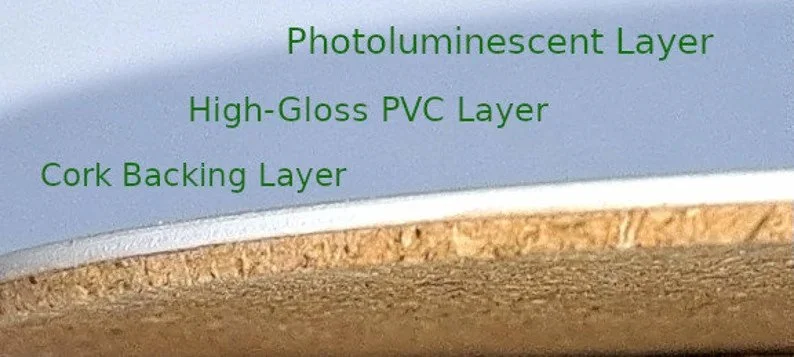 Most glow-in-the-dark objects are ONLY photoluminescent alkaline earth metal aluminate oxides in plastic. No matter the type of plastic, they all work the same way. Light penetrates a small distance into the product and the photons are absorbed as electrons into the oxides. Over time, the oxides release the “extra” electrons as photons in all directions.